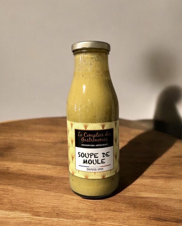 Ingrédients : Eau, moules décoquillées cuites 11%, vin blanc (sulfites), huile de tournesol, lait écrémé reconstitué, amidon transformé de mais, filet de poissons, farine de blé, carotte, beurre, sel, cognac, poireau, poivre, céleri, laurier.